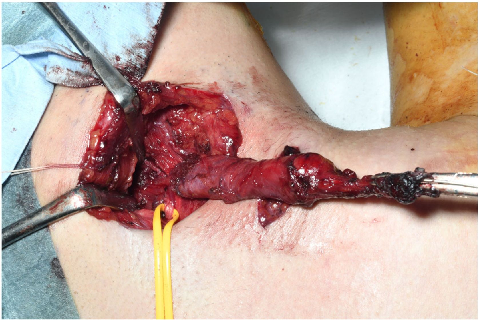 Cervical parallel skin incisions. An elliptical incision around the cervical orifice and a 7-cm transverse skin incision at the level of the hyoid bone are made. The fistulous duct is dissected upward from the surrounding tissue, appearing to taper and branch at the tongue root. A yellow vascular tape is applied over the hypoglossal nerve.