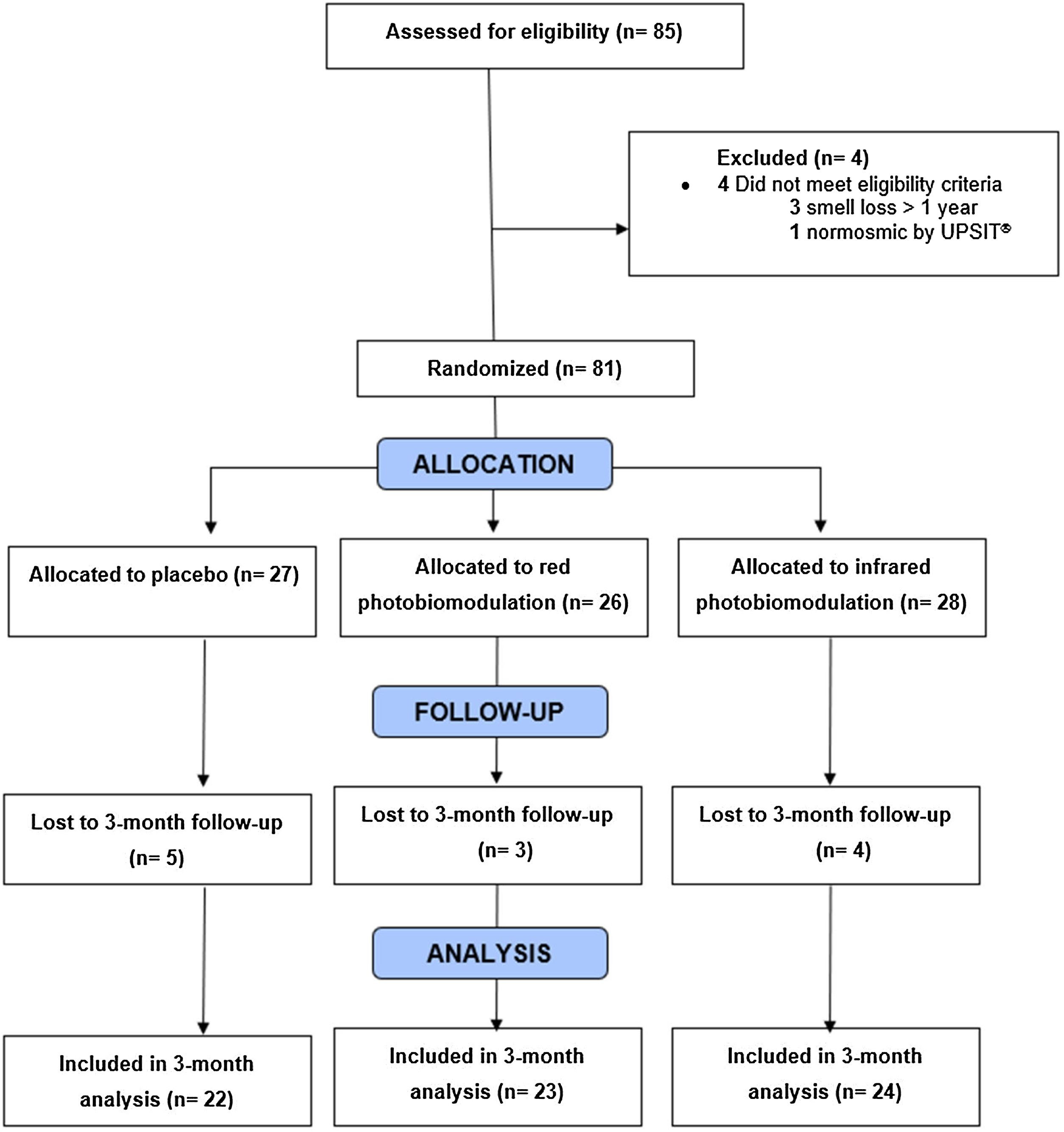 PatientsEighty-one patients 19–59 years of age who experienced persistent olfactory disturbances 1–12 months after SARS-CoV-2 infection were recruited by personal and social media advertisement between January 2021 and October 2022. Recruitment flow diagram is depicted in Fig. 1 according to CONSORT guidelines. Patients with preexisting smell alterations, a history of traumatic brain injury with loss of smell, neurological disorders, classification of normosmia in the first University of Pennsylvania Smell Identification Test (UPSIT®) assessment,29 and the impossibility of completing the proposed follow-up period were excluded.